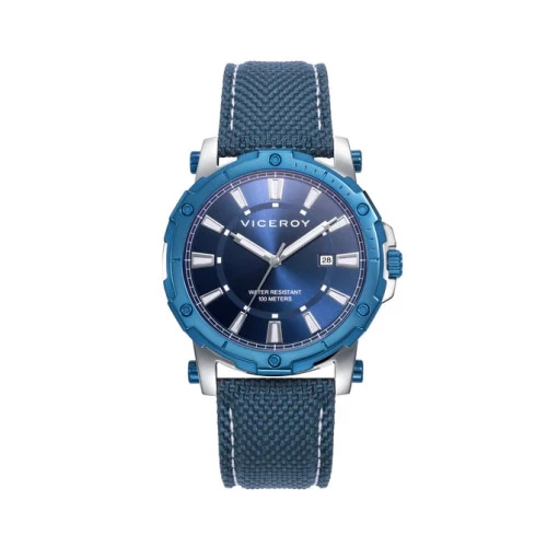 Reloj Viceroy 401311-37 reloj pulsera tres agujas colección Heat para hombre. Caja de acero con bisel ip azul y correa nylon canva azul con pespuntes blancos y hebilla de seguridad Viceroy. Esfera de color azul con con agujas e índices luminiscentes en plateado. Ventana del día del mes en la posición de las tres. Fondo cerrado a rosca. Tamaño de reloj para hombre 42,5 milímetros. Resistente al agua 100 metros. Estuche y garantía Viceroy