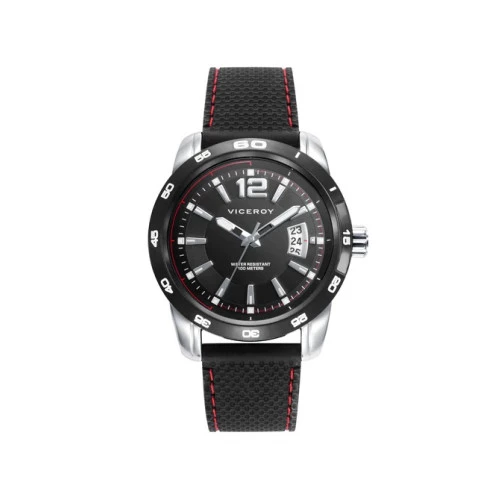 Reloj Viceroy 401319-55 reloj pulsera tres agujas colección Heat para hombre. Caja de acero con bisel ip negro contador de segundos y correa silicona negra resistente con pespuntes rojos y hebilla de seguridad Viceroy. Esfera de color negro con con agujas e índices luminiscentes en plateado. Ventana del día del mes en la posición de las tres. Fondo cerrado a rosca. Tamaño de reloj para hombre 45 milímetros. Resistente al agua 100 metros. Estuche y garantía Viceroy