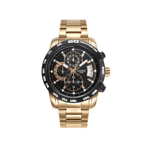 Reloj Viceroy 40421-97 crono para hombre en acero dorado caja y brazalete, esfera en negro con toques dorados, estuche y garantía Viceroy