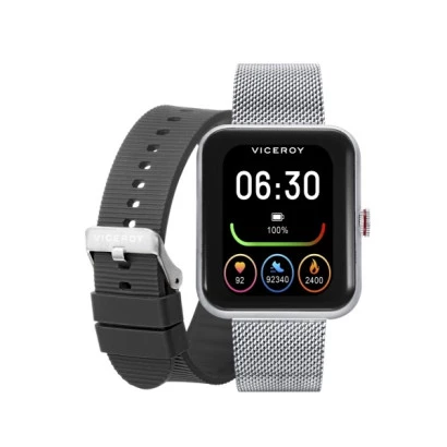 Reloj Viceroy 41119-00 Smartpro unisex. Reloj inteligente smartwatch con caja de aluminio y correa malla milanesa en acero con cierre deslizante de seguridad Viceroy y correa silicona negra adicional con cierre de hebilla. Medida de caja 38 x 45 milímetros. Pantalla táctil con esferas propias para elegir. Podrás recibir todas las notificaciones de las llamadas y de los mensajes, oxígeno en sangre, medir tus pulsaciones, cuenta pasos, distancia realizada, gestión de deportes, cronógrafo, control de calidad del sueño y controlar la música de tu móvil. Compatible con con teléfonos con sistema operativo Android 5.0 o superior, en IOS 10 o superior. Perfecto para la vida diaria. Estuche y garantía oficial Viceroy