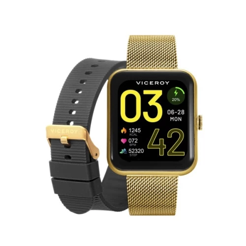 Reloj Viceroy 41119-90 Smartpro unisex. Reloj inteligente smartwatch con caja de aluminio ip dorado y correa malla milanesa en acero ip dorado con cierre deslizante de seguridad Viceroy y correa silicona negra adicional con cierre de hebilla. Medida de caja 38 x 45 milímetros. Pantalla táctil con esferas propias para elegir. Podrás recibir todas las notificaciones de las llamadas y de los mensajes, oxígeno en sangre, medir tus pulsaciones, cuenta pasos, distancia realizada, gestión de deportes, cronógrafo, control de calidad del sueño y controlar la música de tu móvil. Compatible con con teléfonos con sistema operativo Android 5.0 o superior, en IOS 10 o superior. Perfecto para la vida diaria. Estuche y garantía oficial Viceroy