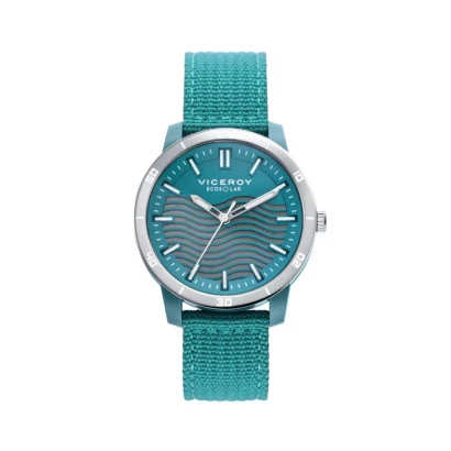 Reloj Viceroy 41133-67 ecosolar para hombre, nunca más cambio de pila, carga con luz. Materiales reciclados, caja de plástico en verde reciclado y correa de nylon reciclado en verde con cierre de hebilla Viceroy de seguridad. Esfera en verde con ondas estampadas con índices y agujas luminiscentes. Tapa cerrada a presión, resistente al agua 30 metros. Diámetro de 42 milímetros. Estuche y garantía oficial Viceroy