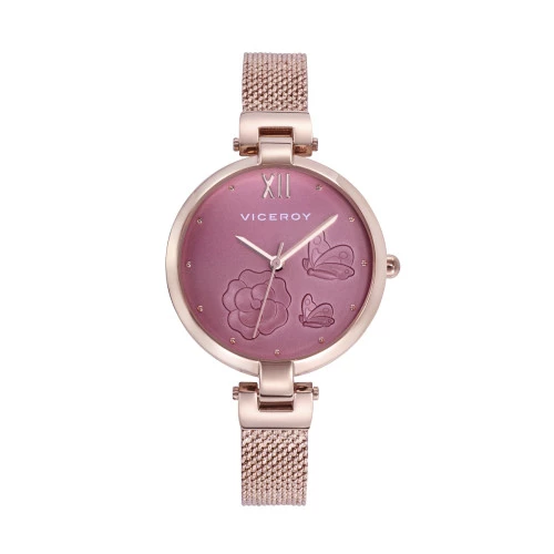 Reloj Viceroy 42426-73 para mujer tres agujas, esfera rosa flor y mariposas, malla milanesa ip rosa, estuche y garantía Viceroy
