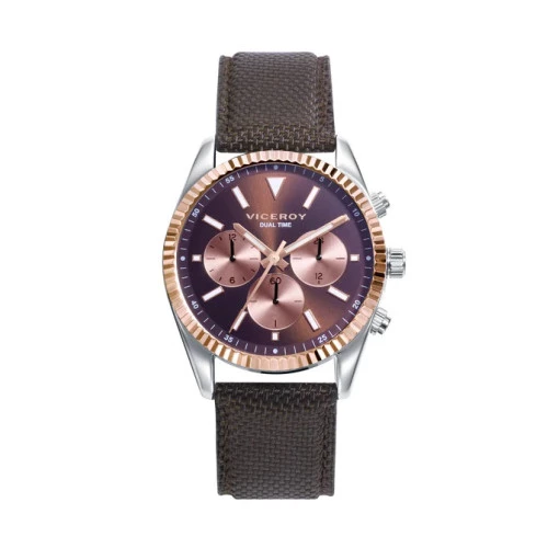 Reloj Viceroy 42441-47 reloj pulsera multifunción colección Chic para hombre. Caja en acero con bisel elegante troquelado ip rosa y correa nylon canva con pespuntes y hebilla de seguridad Viceroy. Esfera de color marrón con subesferas crono en la posición tres, seis y nueve con agujas contadores en negro. Agujas e índices luminiscentes dorados rosa. Pulsadores en acero. Fondo cerrado a rosca. Tamaño de reloj para hombre 41 milímetros. Resistente al agua 100 metros. Estuche y garantía Viceroy