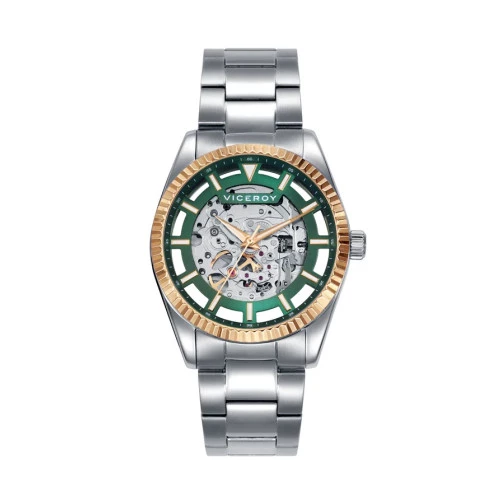Reloj Viceroy 42447-67 elegante automático esqueleto para hombre colección Chic. Caja de acero con bisel troquelado en dorado con brazalete de acero con cierre de seguridad Viceroy. Esfera con verde, transparente se aprecia movimiento con índices y agujas en dorado con luminiscente. Resistente al agua. Tamaño para hombre, medida de caja 41 milímetros de diámetro. Fondo transparente se aprecia maquinaria reloj automático. Estuche y garantía oficial Viceroy