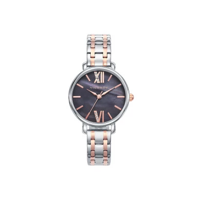 Reloj Viceroy para mujer en acero sólido bicolor, tres agujas y esfera en madreperla en oscuro con piedras en indices en rose y agujas en rose,