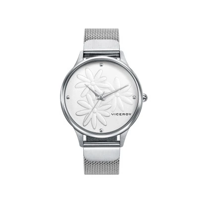 Reloj Viceroy 461120-07 para mujer en acero, caja y correa milanesa, esfera en blanco con flores en relieve, garantía Viceroy