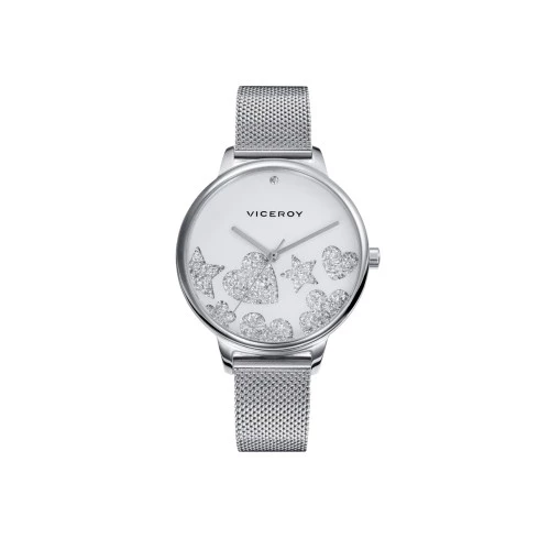 Reloj Viceroy para mujer en acero, 461142-00 esfera en blanco con corazones y flores con piedras, brazalete malla, estuche y garantía Viceroy