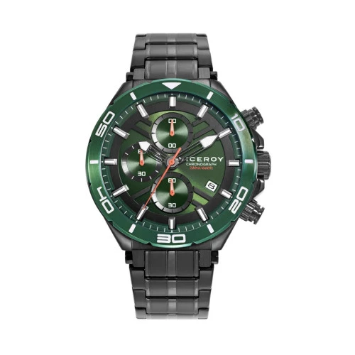 Reloj Viceroy 46841-67 reloj pulsera cronógrafo colección Heat para hombre. Caja de acero y brazalete de acero ip black negro con cierre desplegable y solapa de seguridad Viceroy. Bisel en verde. Esfera de color verde con subesferas de la función cronometro en la posición seis, nueve y doce con agujas contadores naranjas. Índices y agujas luminiscentes. Pulsadores del crono en acero. Fondo cerrado a rosca. Tamaño de reloj para hombre 44 milímetros. Resistente al agua 200 metros. Estuche y garantía Viceroy