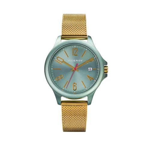 Reloj Viceroy 471250-65 para mujer, en aluminio, esfera en verde calendario, malla milanesa dorada, estuche y garantía Viceroy
