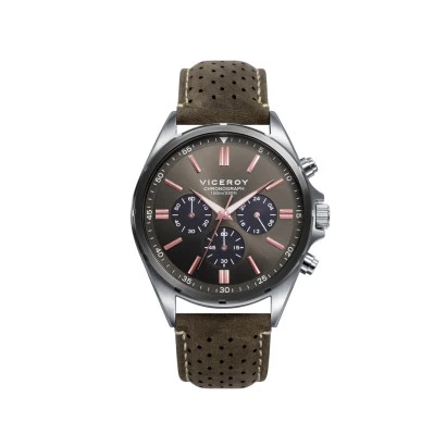 Reloj Viceroy 471297-57 para hombre, en acero caja y correa de piel verde grisáceo con pespuntes blancos, esfera en negro, cronógrafo, resistente al agua 100 metros. Estuche y garantía Viceroy.