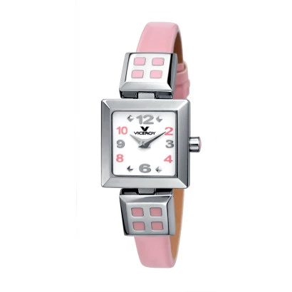 Reloj Viceroy con caja de acero con esfera en blanco en cuadrado y números arábigos y correa de piel en rosa con adornos cuadrados con esmalte pulsera