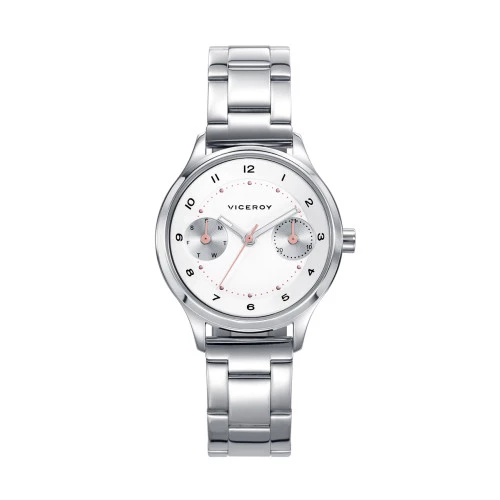 Pack reloj Viceroy cadete 461116-99 reloj de pulsera para niña comunión colección Sweet. Reloj Viceroy con caja de acero, diámetro de la caja 30 milímetros y brazalete de acero con cierre desplegable con doble pulsador de seguridad Viceroy. Esfera en blanco con esferas calendario, números arábigos en negro, agujas luminiscentes y aguja segundero en rosa. Resistente al agua. En estuche, reloj Viceroy y pendientes cerezas en plata dorada con cierre tuerca presión de seguridad Viceroy. Estuche y garantía Viceroy