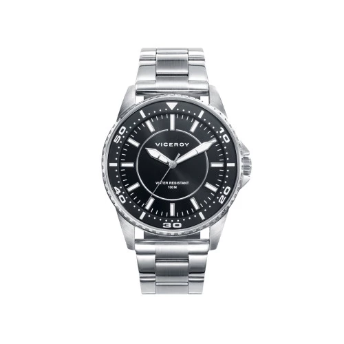 Pack reloj Viceroy cadete 46773-99 reloj de pulsera para cadete comunión colección Next. Reloj Viceroy unisex tamaño cadete con caja de acero bisel negro con los número de los segundos en blanco. diámetro de la caja 38,2 milímetros. Brazalete de acero con cierre desplegable de seguridad Viceroy. Esfera en negro agujas e índices luminiscentes. Resistente al agua 100 metros. En estuche pulsera actividad en negro incluida. Garantía Viceroy