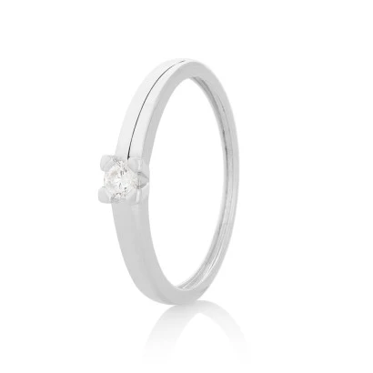 Anillo solitario joya en oro blanco 750 milésimas con diamante talla brillante 0,09 ct, brazo del anillo del mismo ancho que la garra, ideal regalo de pedida compromiso