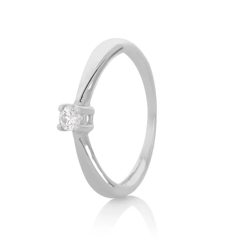 Anillo solitario joya en oro blanco 750 milésimas con diamante talla brillante 0,09 ct engarzado en una garra brazo abierto con cuadradillo, ideal regalo de pedida compromiso