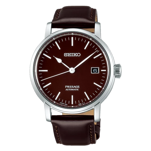 Reloj Seiko spb115j1 Presage esmalte Riki Wanatabe, tres agujas en blanco sobre fondo marrón de la esfera acero, correa de piel, zafiro, calibre 6r35. Garantía Seiko
