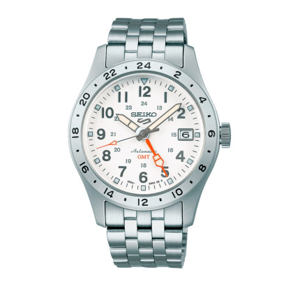 Reloj SSK059K1 Seiko 5 Sports Field Sports Style GMT automático para hombre. Calibre 4r34 detención de segundero. Automático, 24 rubíes, 21.600 alternancias por hora con 41 horas de reserva de carga. Esfera en blanco tres agujas, agujas e índices número arábigos luminiscentes. Aguja GMT en naranja segundo huso horario . Calendario en la posición de las tres. Caja de acero con bisel las 24 horas, corona para el cambio de hora en la posición de las tres. Brazalete de acero con cierre desplegable tres pliegues y solapa de seguridad. Fondo cerrado a rosca caja transparente. Cristal Hardlex curvado. Resistente al agua 100 metros. Diámetro de la caja 39,4 milímetros y 13,6 de grueso. Estuche y garantía oficial Seiko