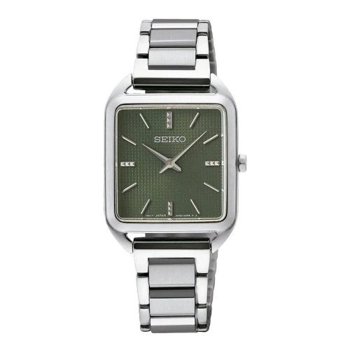 Reloj Seiko swr075p1 cuadrado colección Ladies para mujer con calibre 4n30 made Japan. Caja y brazalete de acero con cierre tres pliegues con botón de apertura de seguridad Seiko. Esfera en verde con índices y agujas en plateado. Resistente al agua 100 metros. Medida de caja 26 milímetros, 6,4 de grueso y peso de 63 gramos. Estuche y garantía oficial Seiko