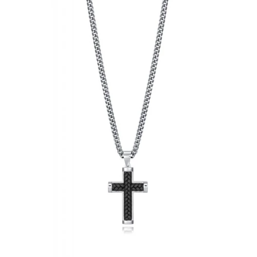 Colgante collar cadena con cruz en acero con cordón trenzado.