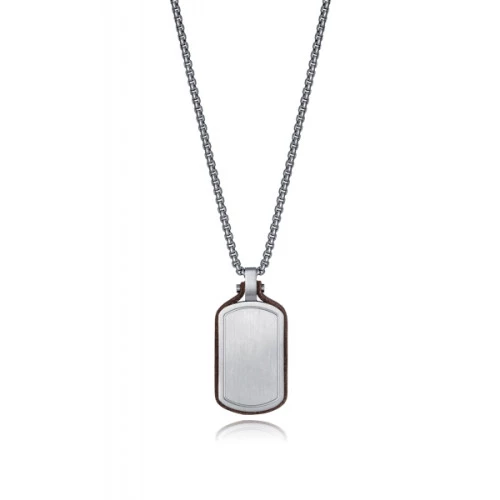 Cadena de acero de 50 centímetros, con colgante rectangular en acero con reborde cuero marrón y acabado cepillado rayado tipo militar .