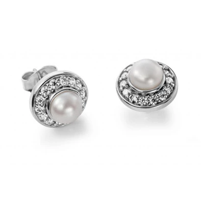 pendientes elegantes en plata con piedras blancas y una perla central