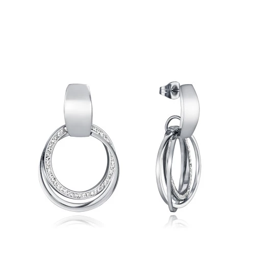 Pendientes que cuelgan en acero plateado con tres anillas redondas medianas, una con circonitas engarzadas.