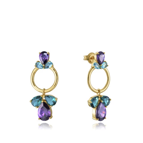Viceroy pendientes 13095e100-59 colección Elegant para mujer en plata de ley 925 con baño de oro amarillo con tres cristales forma de pera azules y moradas y anilla con cristales morados y azules que cuelgan. Pendientes trae cierre de tuerca de presión de seguridad Viceroy. Estuche y garantía Viceroy