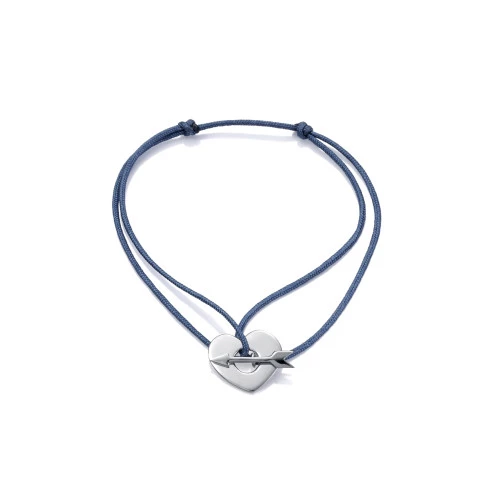 pulsera cordón en azul ajustable a cualquier medida con corazón con flecha de plata de ley 925 milésimas