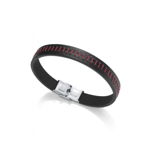 Pulsera de piel cuero negro liso con pespunte rojo, con cierre de solapa y pestaña de seguridad Viceroy.