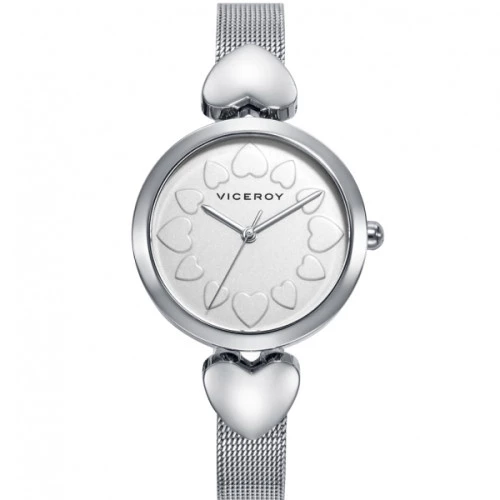 Reloj Viceroy 401138-07 para mujer colección Kiss. Caja en acero, correa brazalete milanesa con cierre de lengueta deslizante. Esfera en gris con agujas en plateado en índices con corazones. Resistente al agua. Diámetro de la caja 32 milímetros. Estuche y garantía oficial Viceroy.