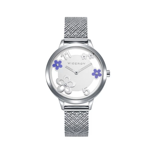 Viceroy reloj 471296-85 para mujer en acero caja y brazalete milanesa, esfera blanca flores plateadas y moradas, garantía Viceroy